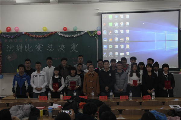 在北湖校区西阶201举行“电气之音”校园文化艺术节系列活动之“长征,长征”主题演讲比赛总决赛,学生会副主席白东平、组织部部长付金续、白马辩论协会会长张博华、宣传部副部长张笑鸣、歆航书友会会长李文彦、歆航副会长易霄林出席本次活动并担任评委。